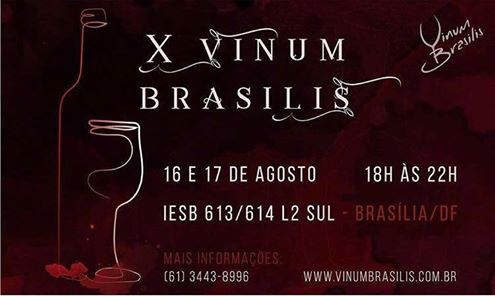 Nos dias 16 e 17 de agosto acontecerá mais uma edição da Vinum Brasilis. O evento que reunirá mais de 25 vinícolas do Brasil levará à Brasília um pouco da vinicultura brasileira. No evento os visitantes poderão apreciar mais de 100 vinhos, que estarão disponíveis para degustação.